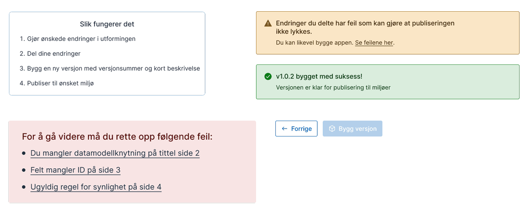 guides users from build to publish without relying on memory