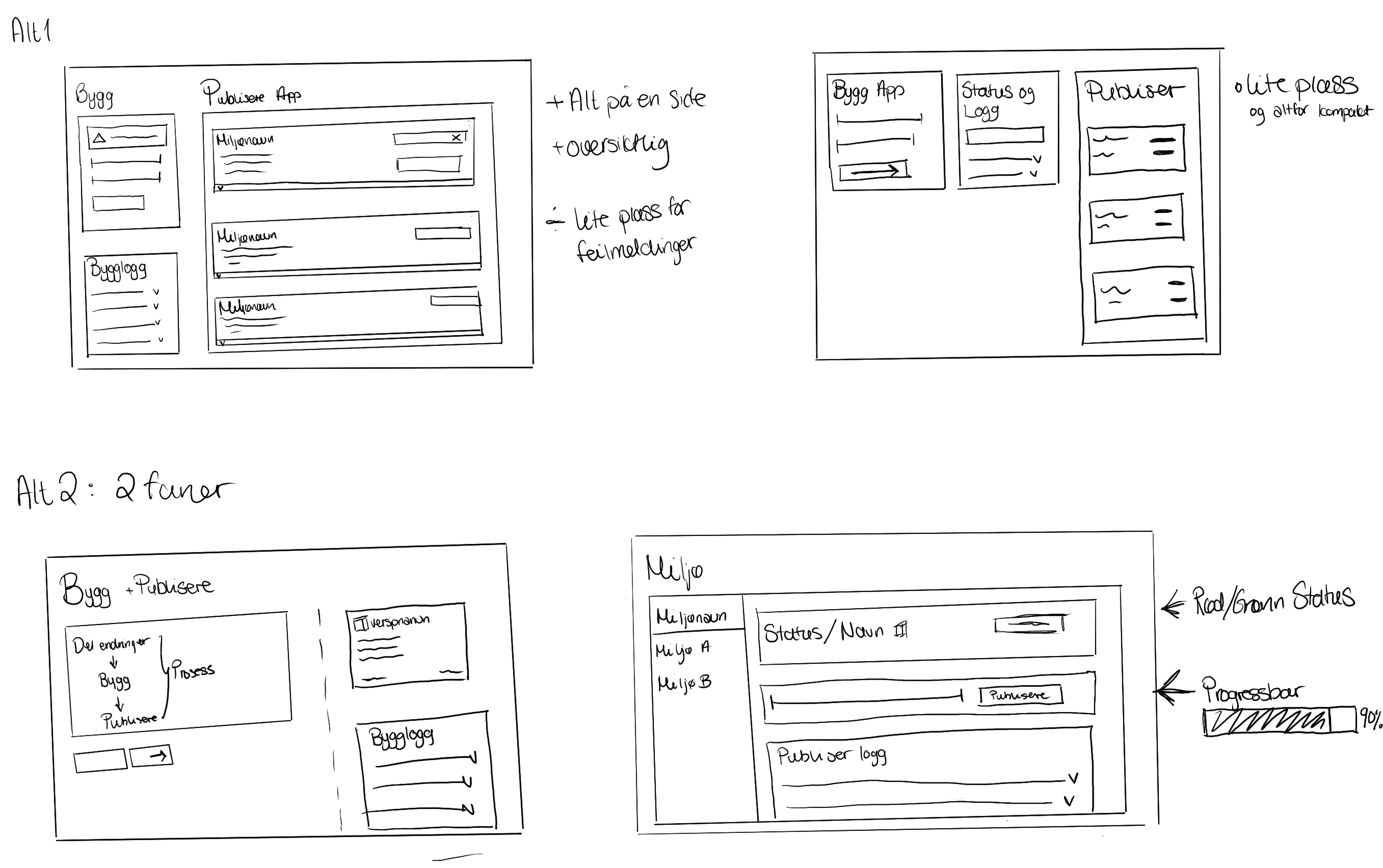 Conceptual sketches and wireframes exploring different ways to structure the deployment flow.