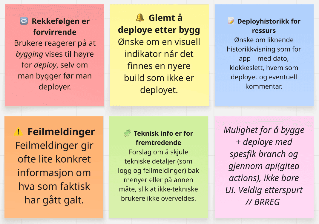 Summary of all findings, grouped into shared themes. Different colours represent insight categories identified across user input.